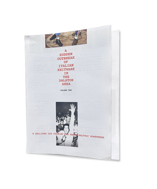 The latest edition of 'A Sudden Outbreak of Italian Knitware In The Dalston Area' Volume Two a Galliano Cus Fanzine is now available in limited supply.